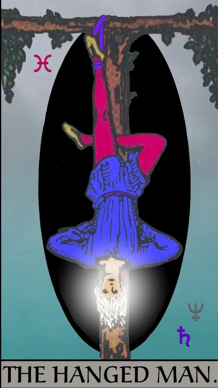 The tarot Hanged Man hangs by his left foot, which is tethered to his tree by a cord. The cord is his Fate, made in his past, that drew him here and binds him now. Providence leaves his right foot unbound, to choose his future steps by free will. But his walk has been suspended. His legs are crossed, suggesting his current position at ‘crossroads’, not walking any path, but poised for detached contemplation of possible options and reorientation. Both his past and his future are ‘in suspense’, for he is in a state of timelessness. His hands are tied behind his back, useless for nonexistent work. We see him upside down because his belief and disbelief have flipped; now it’s another, inner world that’s real to him instead of the outer earth world. By the brilliant white glow around his head we know that his soul is purified in Light. The serene expression on his face reflects the peace in his dreams.